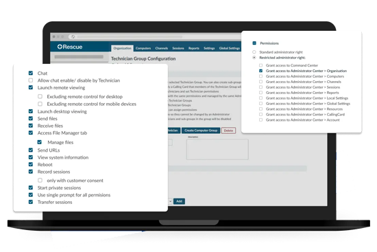 Crie e atribua administradores e técnicos a grupos específicos, configure permissões em um nível granular e monitore técnicos em tempo real durante a sessão.